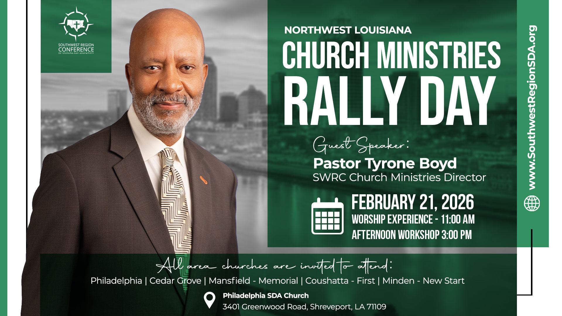 The Southwest Region Conference is one of five local conferences that make up the Southwestern Union of Seventh-day Adventists. While our membership reflects the rich diversity of the communities we serve, the majority of our constituency represents the vibrant African-American population across our territory.